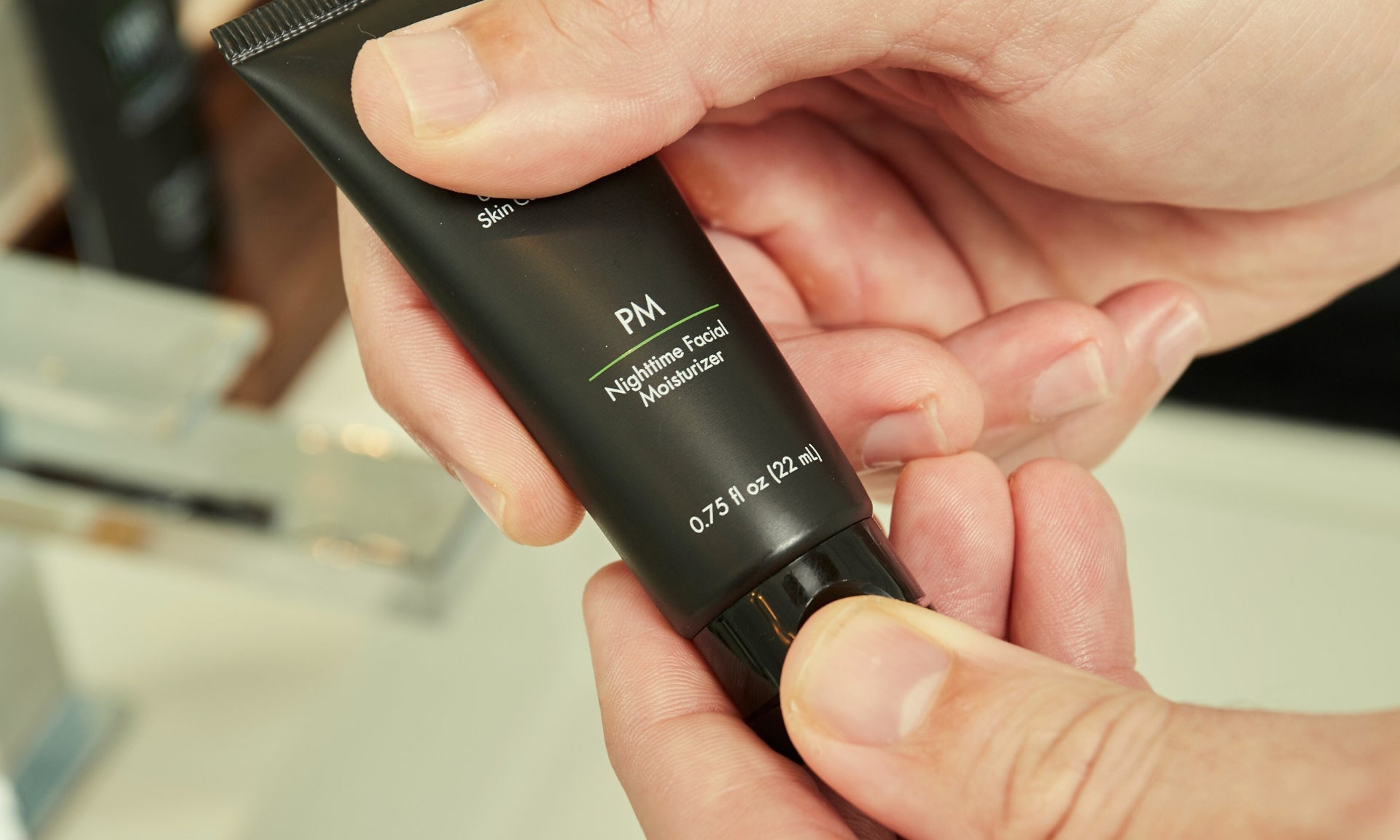 Use PM with a clean and dry face at night. Squeeze a pea-sized amount of PM into your fingertips. Rub your hands together softly to disperse the product into your hands. Apply PM all over while avoiding your eyes and mouth. It will only take a few seconds for your skin to absorb it.
